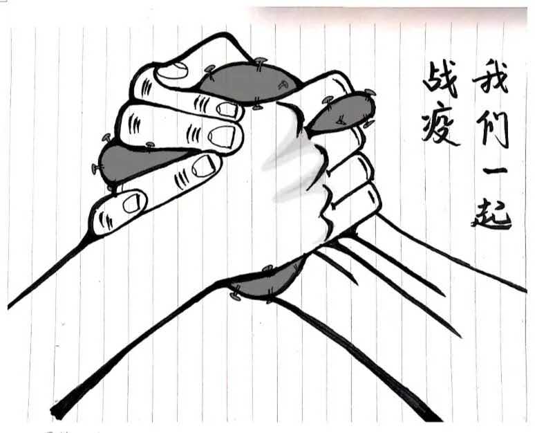 两人手中所握灰色物体意味着新冠肺炎病毒;两只手意味着中国的每一个同胞;紧握的手意味着同舟共济,众志成城,携手共进,共同奋斗。这幅画意味着,希望我们每一位中国人都能携手共进,共同抵抗病毒,消灭病毒,为自己也为我们的国家创造一个健康幸福的生活环境。战疫,我们一起共进退。加油,武汉;加油,中国!